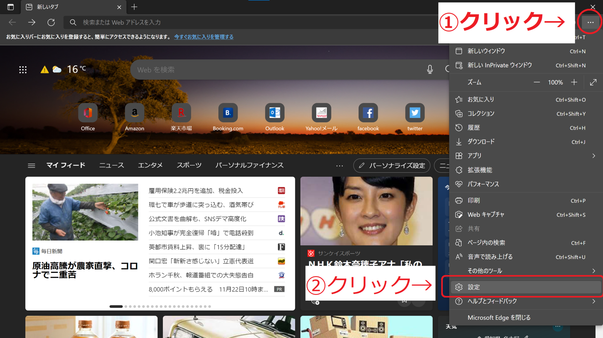 1.Microsoft Edgeを開き、画面右上の「…」をクリック