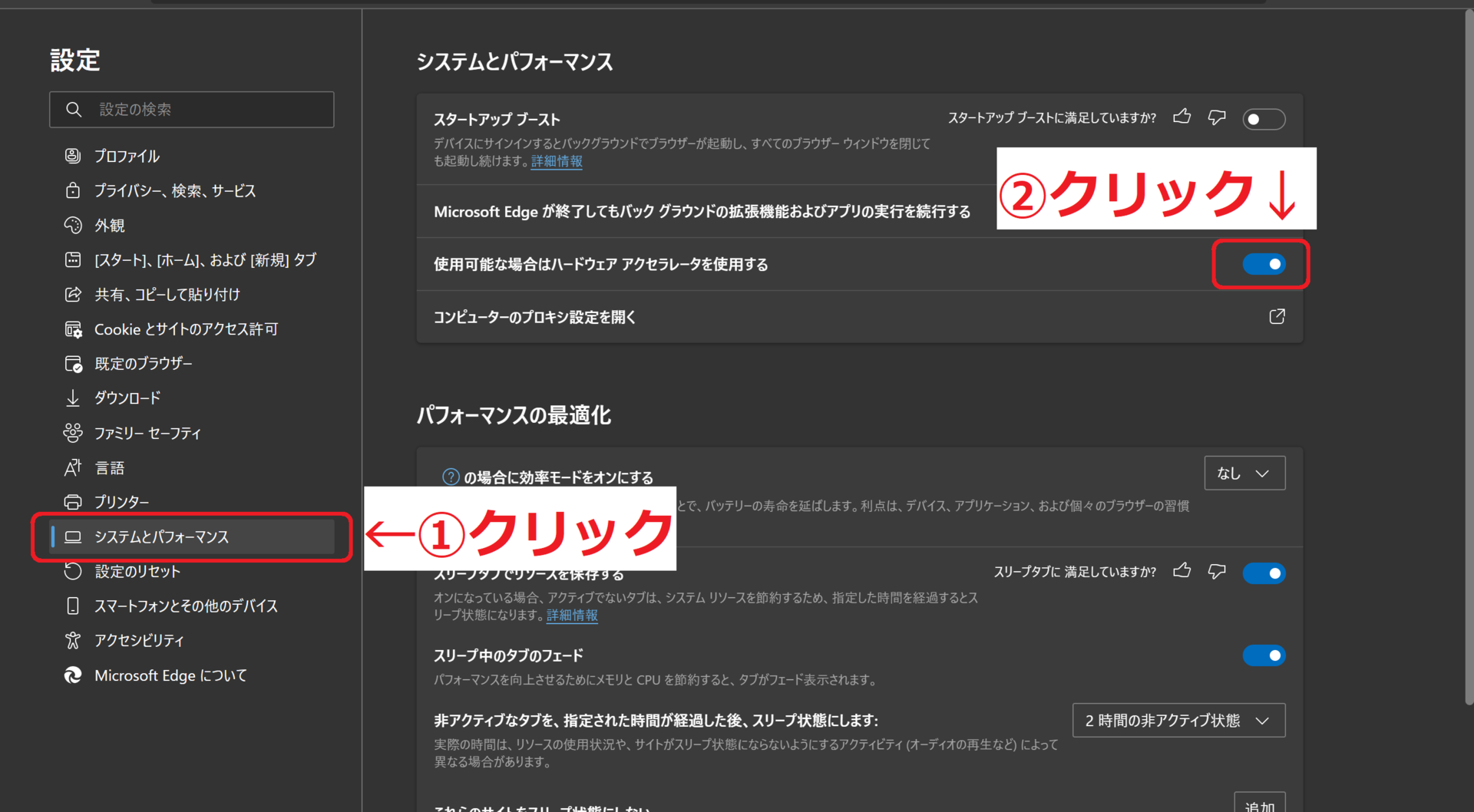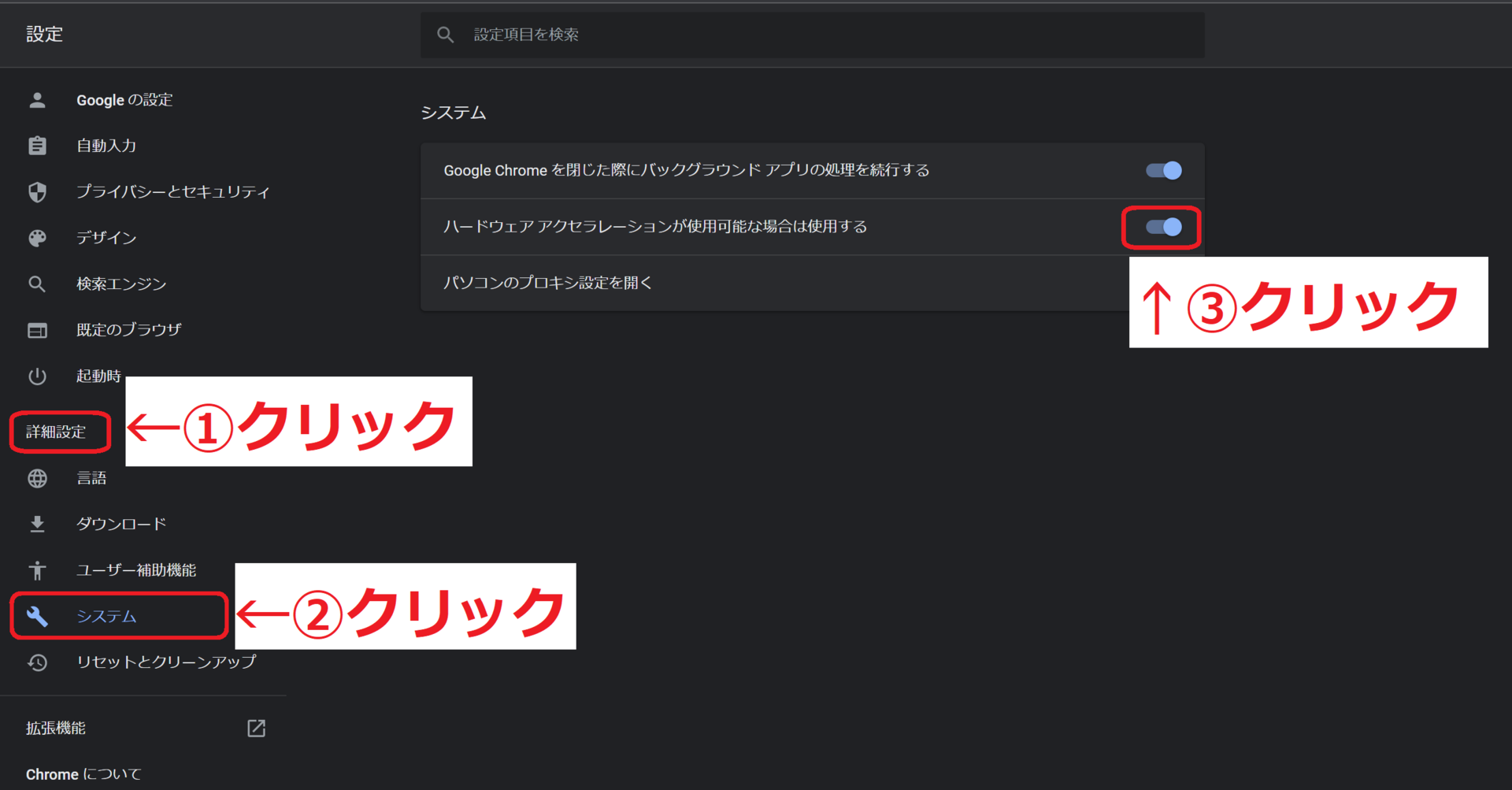 4.「使用可能な場合はハードウェアアクセラレータを使用する」をクリックして機能をOFFにする。(グレーになっていればOK)