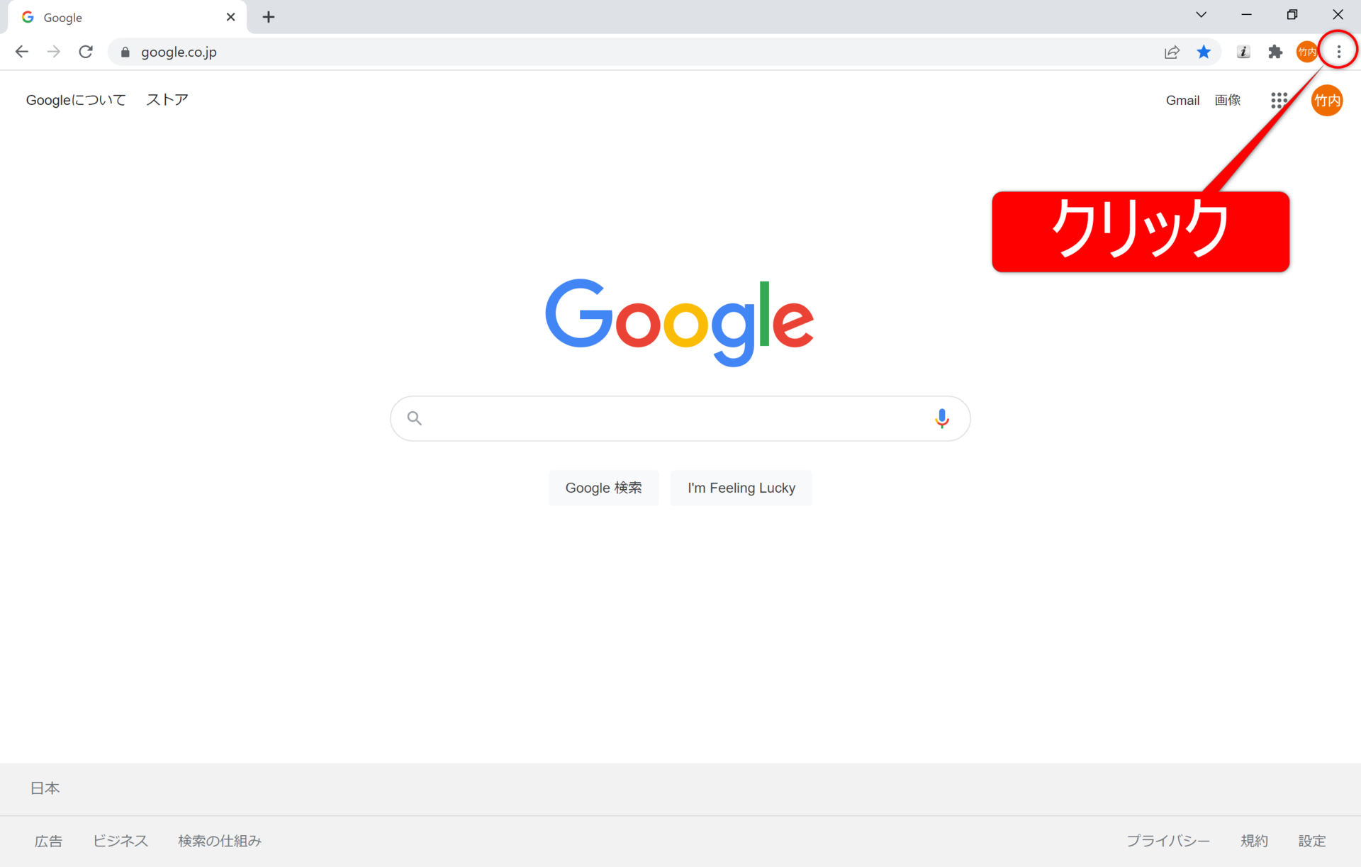 ①画面上部の「Google Chromeの設定(縦に3つ点が並んでいます)」をクリックします。