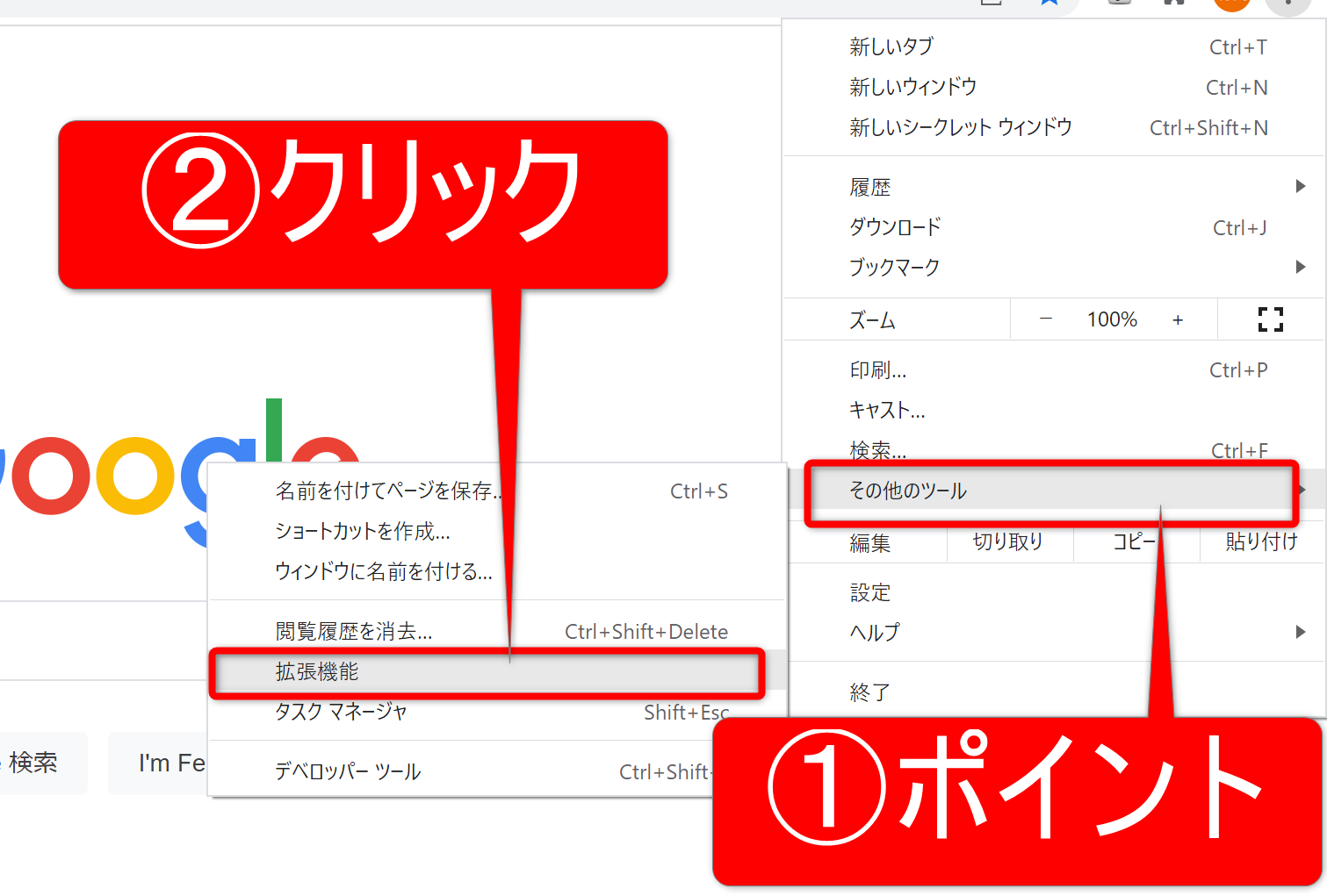 ②「その他のツール」をポイントします。つづいて左側に表示される「拡張機能」をクリックします。