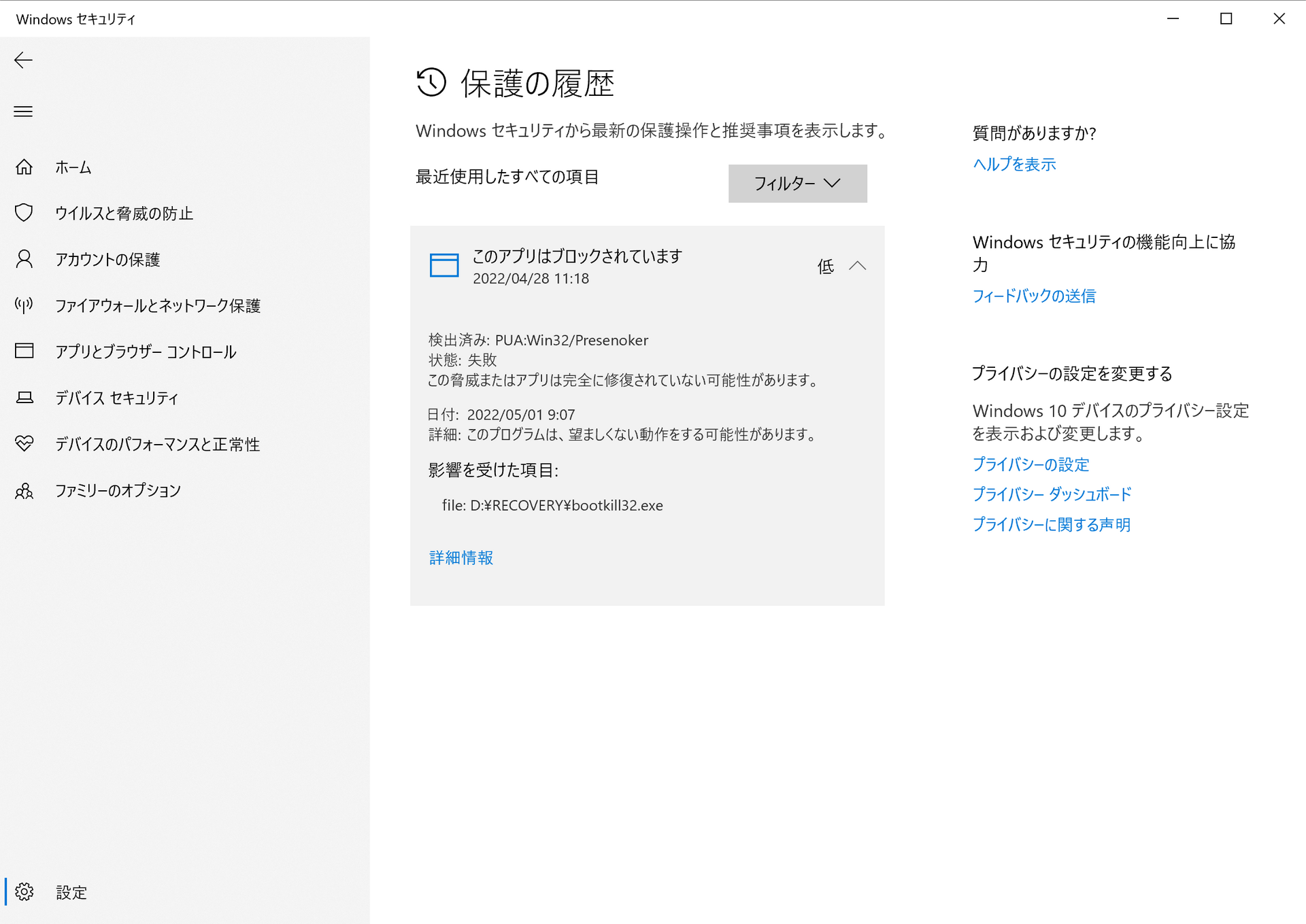 そこで、このアプリ「PUA:WIN32/PRESENOKER」がなんなのか調べるために、「保護の履歴」をクリックしてみました。