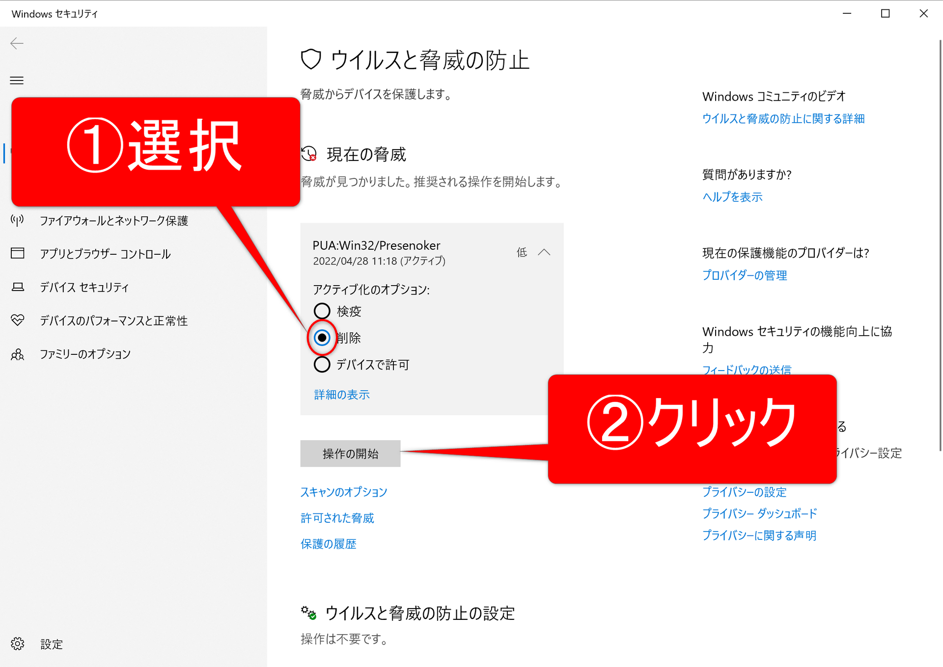 ①「PUA:WIN32/PRESENOKER」を選択し、「削除」のチェックボックスをクリックする。