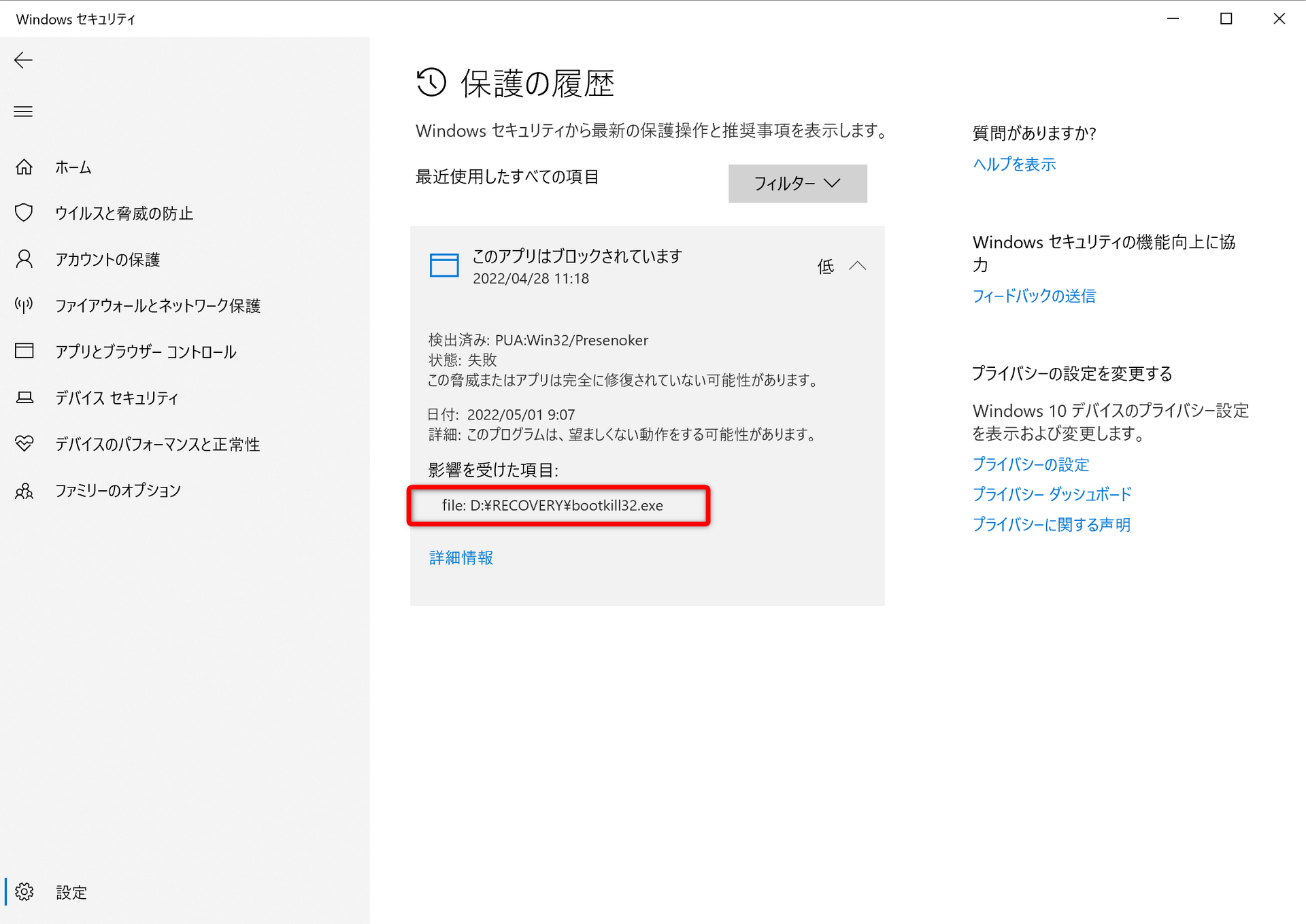 このケースでは、Lenovoのリカバリーメディア内のプログラムがWindows Defenderによって誤検知されてしまっていたようです。