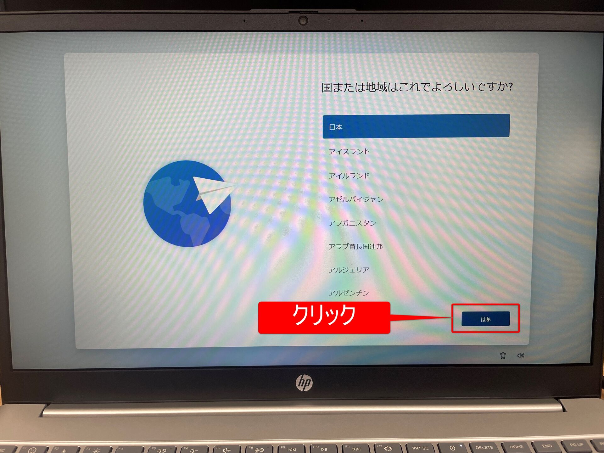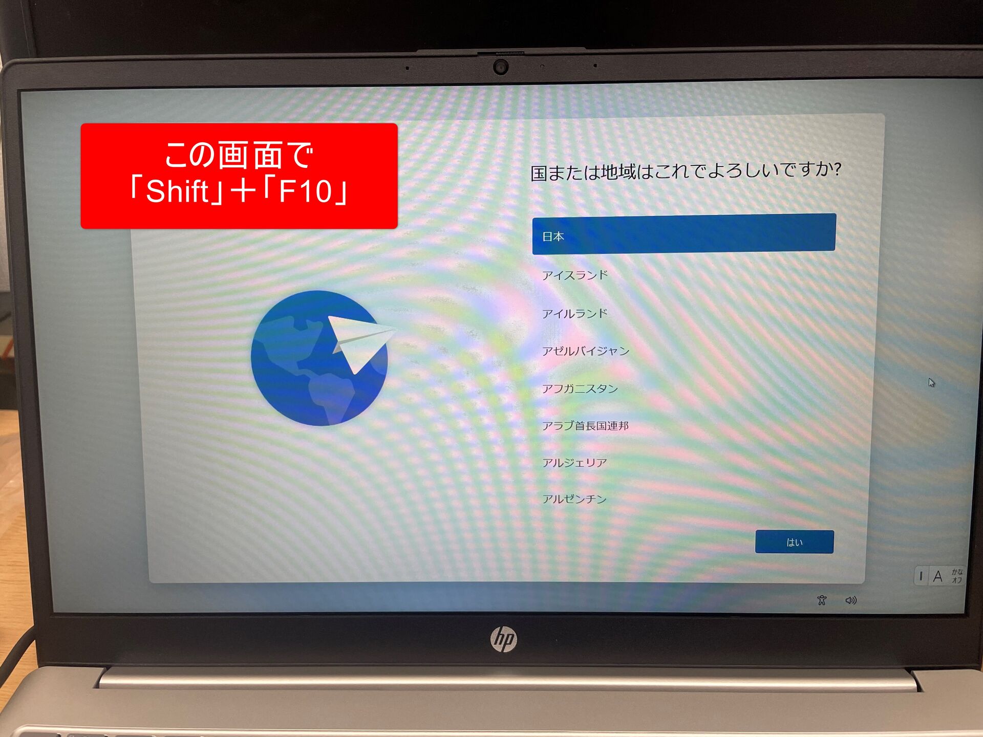 ①国または地域を選択する画面に来たらキーボードの「Shift」キーを押しながら「F10」キーを押す