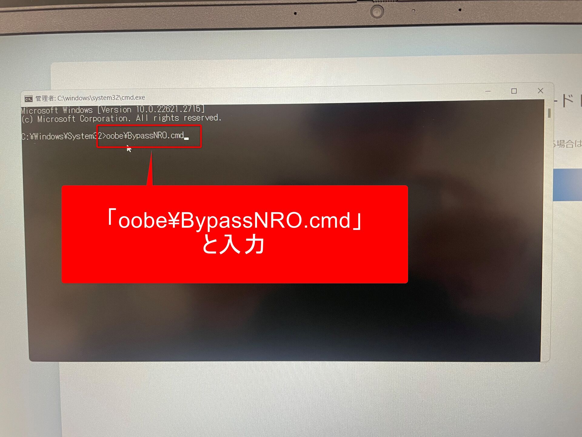 ②コマンドプロンプトが開く。黒い画面をクリックして「oobe\BypassNRO.cmd」と入力する。