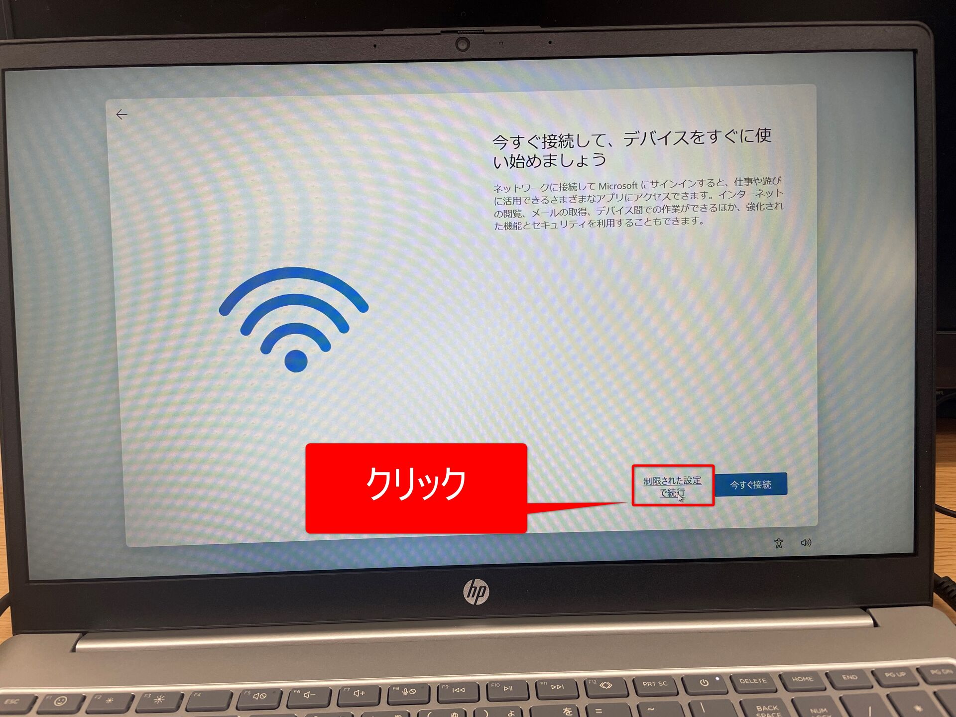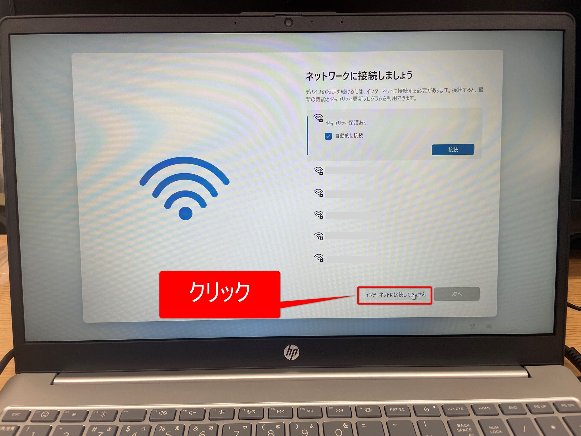 ローカルアカウントでWindows 11をセットアップする場合、最初にネットを切断した状態でPCを起動します。