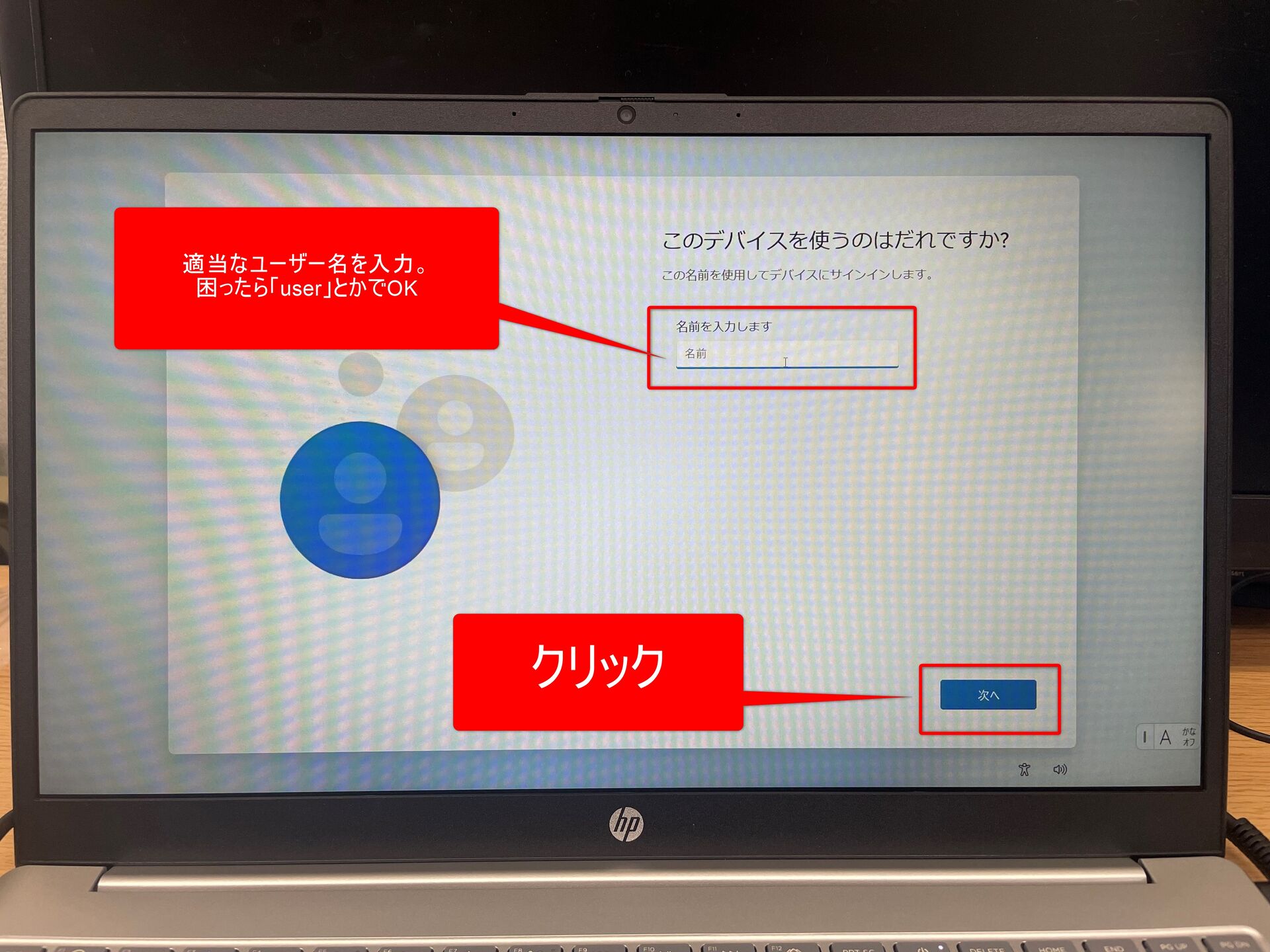 ⑩ユーザー名を入力する。ご自分の名前でもOKですし、面倒なら「user」とかでOKです。