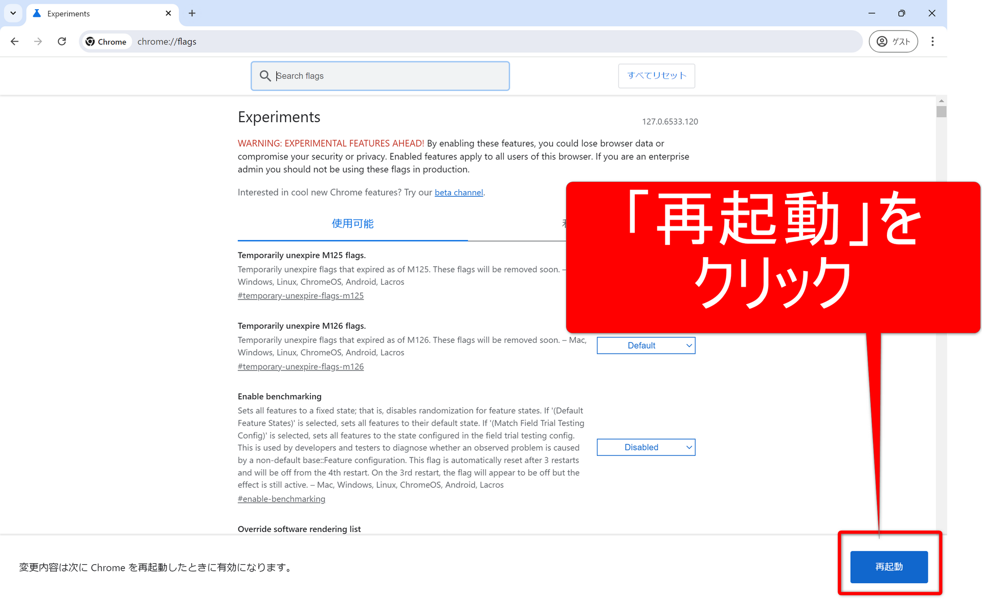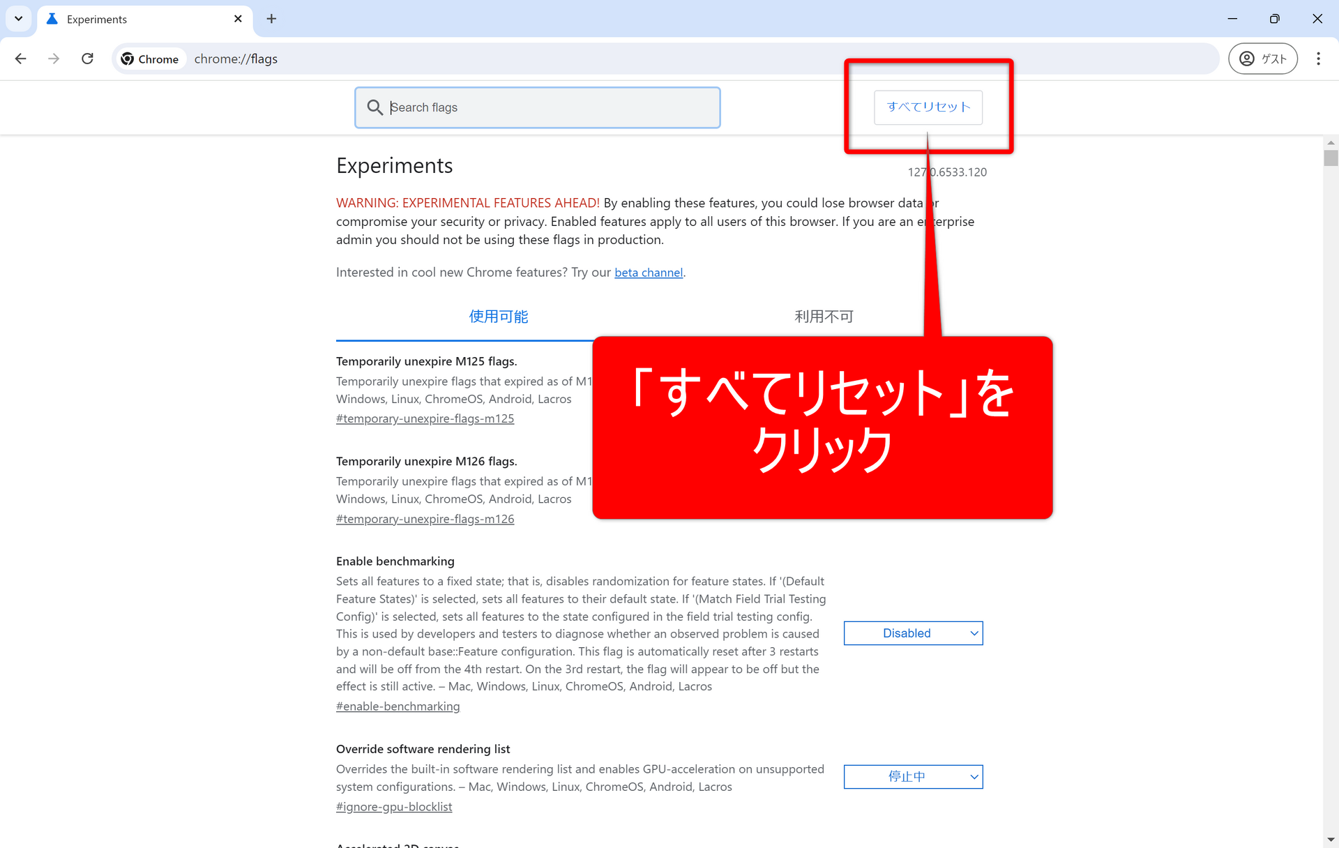 ①Google Chromeのアドレスバーに「chrome://flags」と入力