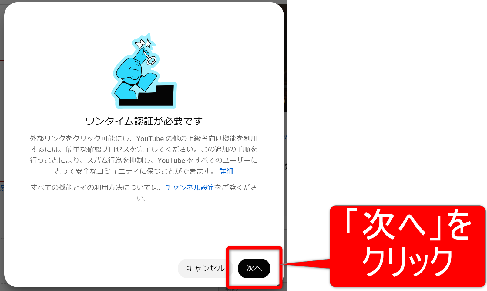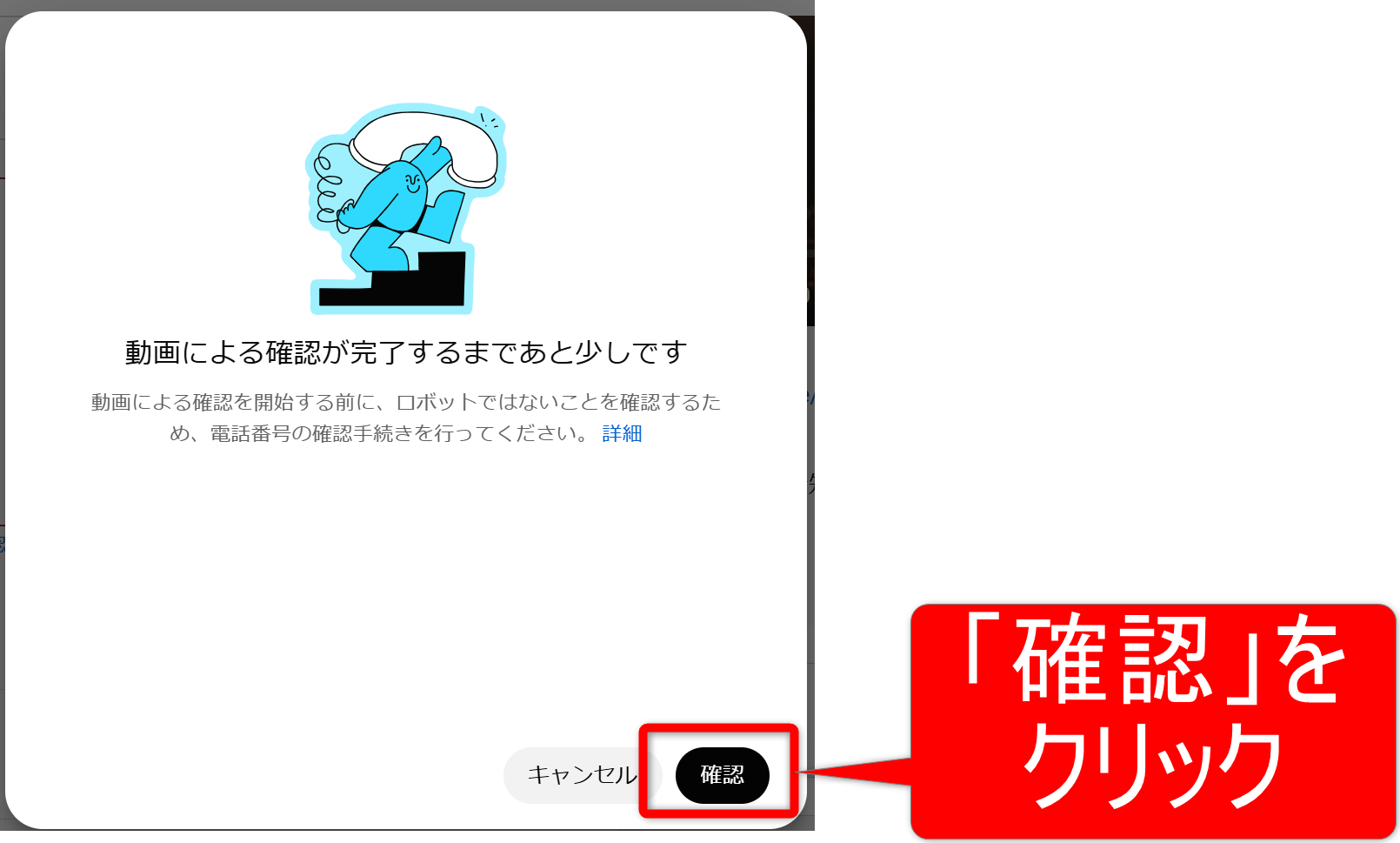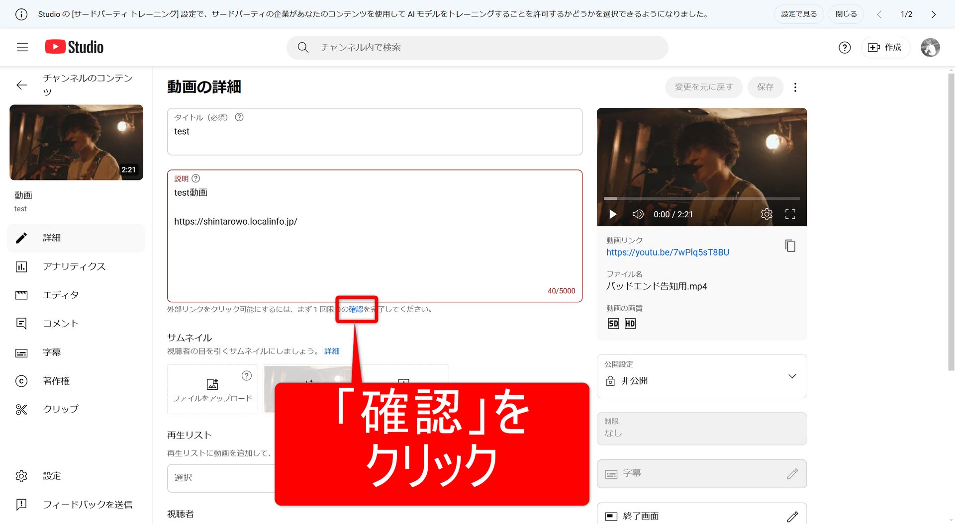 ②動画の説明文の下の「外部リンクをクリック可能にするには、まず 1 回限りの確認を完了してください。」の「確認」をクリック