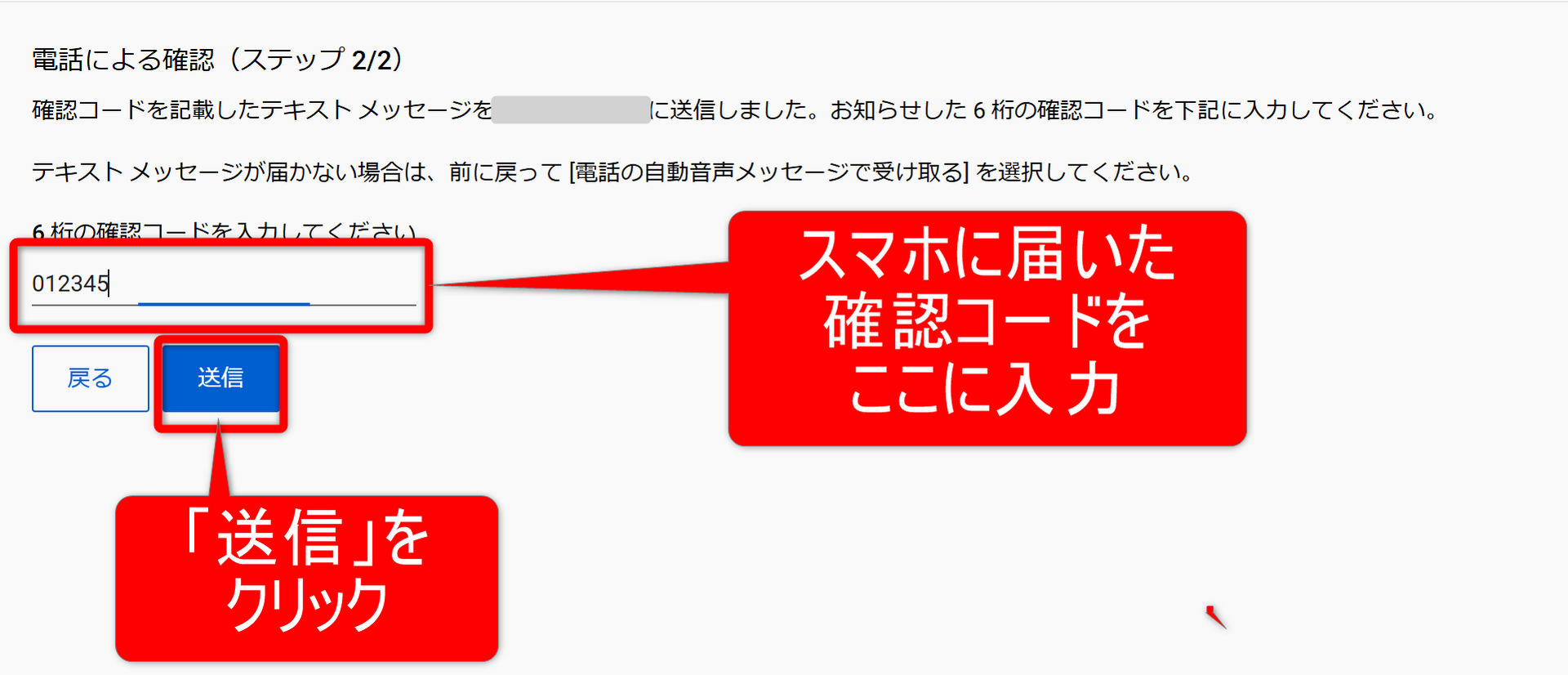 「6桁の確認コードを入力してください。」の下に、届いた確認コードを入力します。