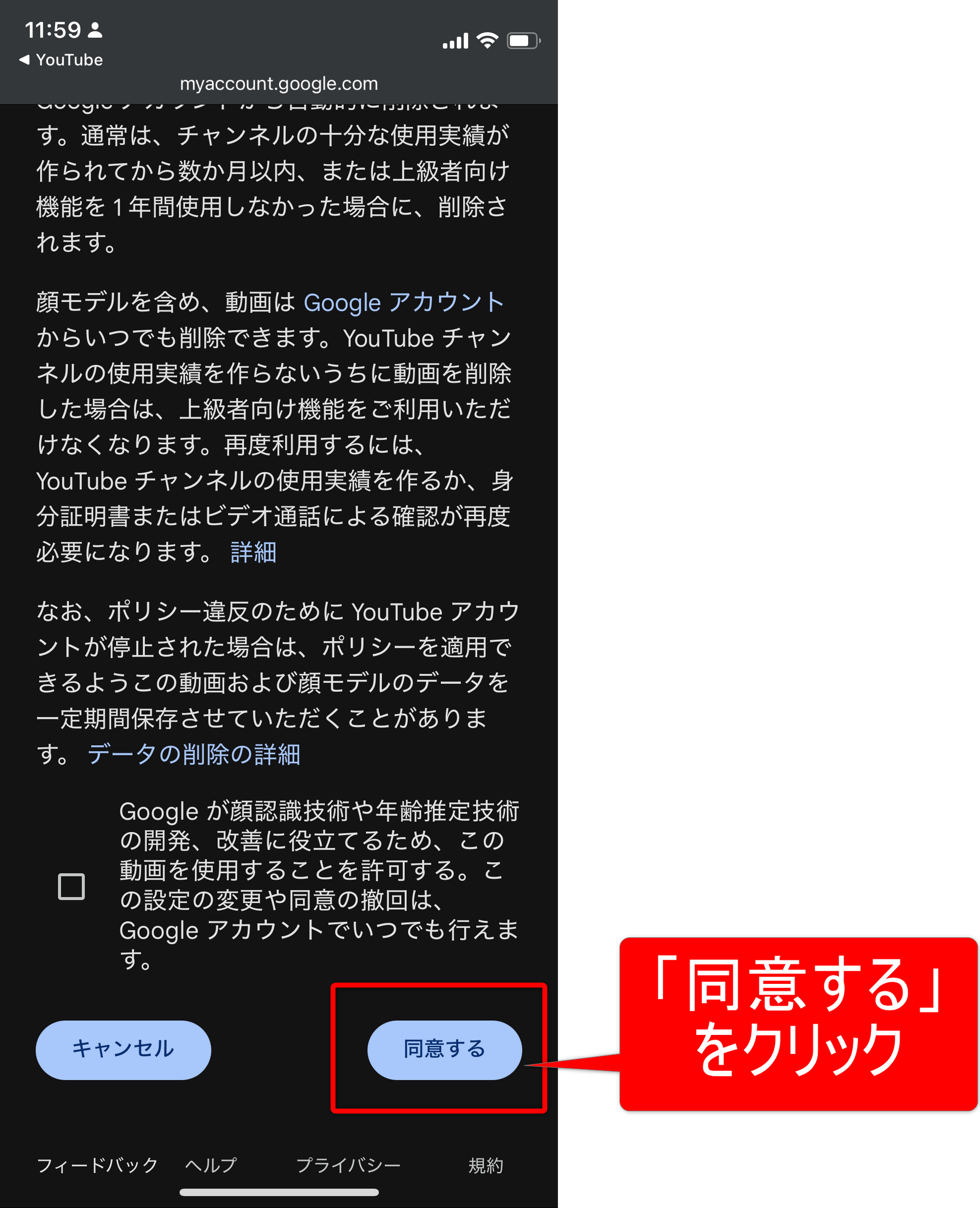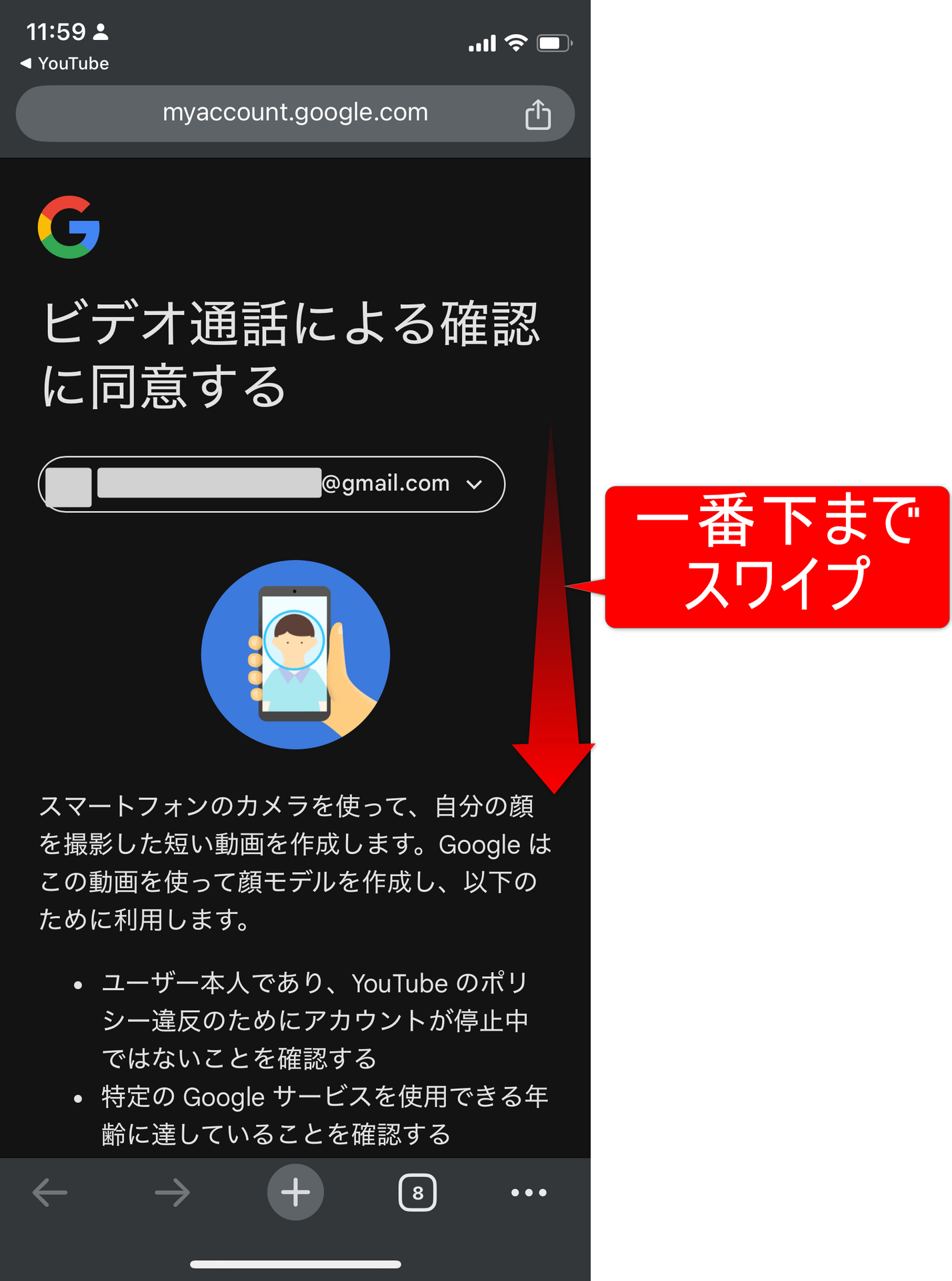 ⑰「ビデオ通話による確認に同意する」と画面が表示されたら、ページの一番下までスワイプします。
