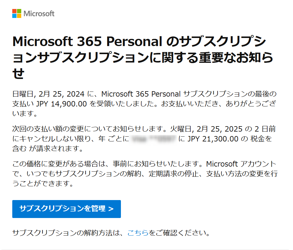 ①「Microsoft 365 ***のサブスクリプションサブスクリプションに関する重要なお知らせ」と記載があるメールを開きます。