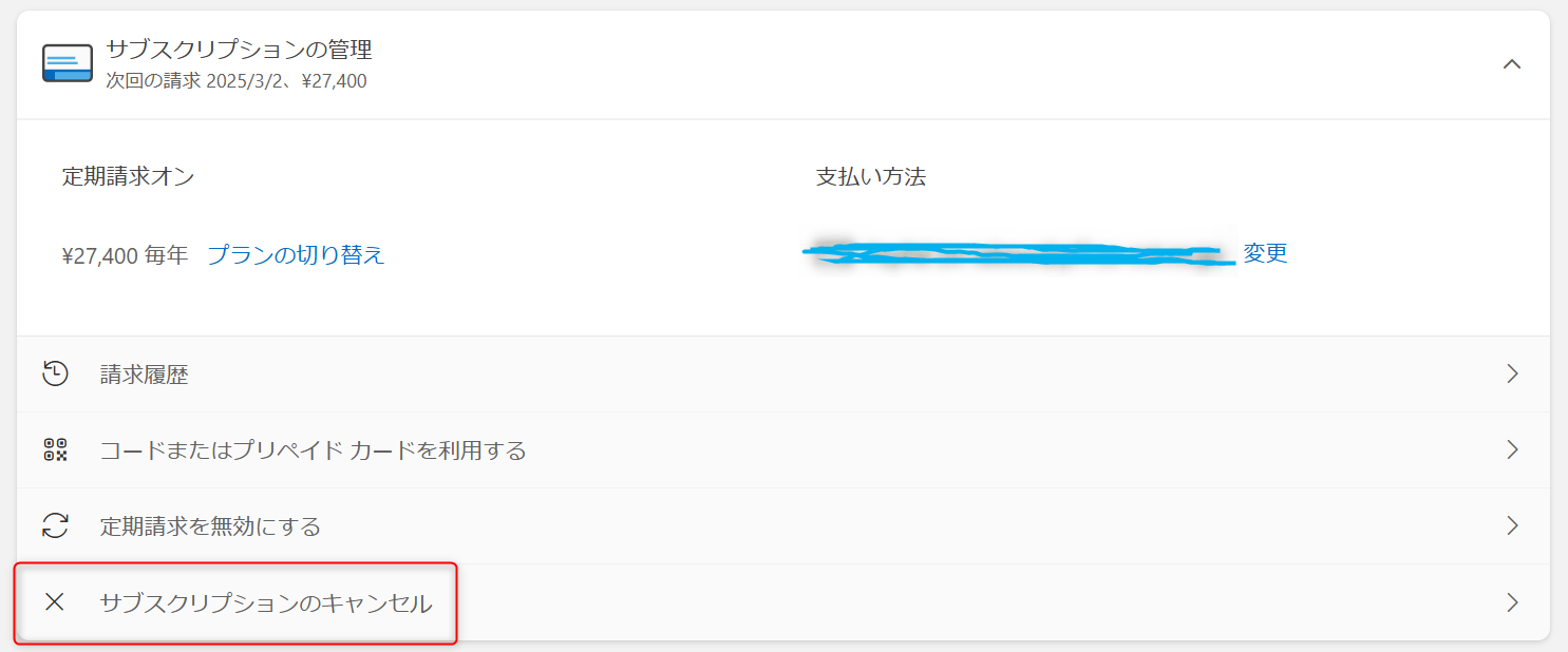 ④「サブスクリプションのキャンセル」をクリックします。