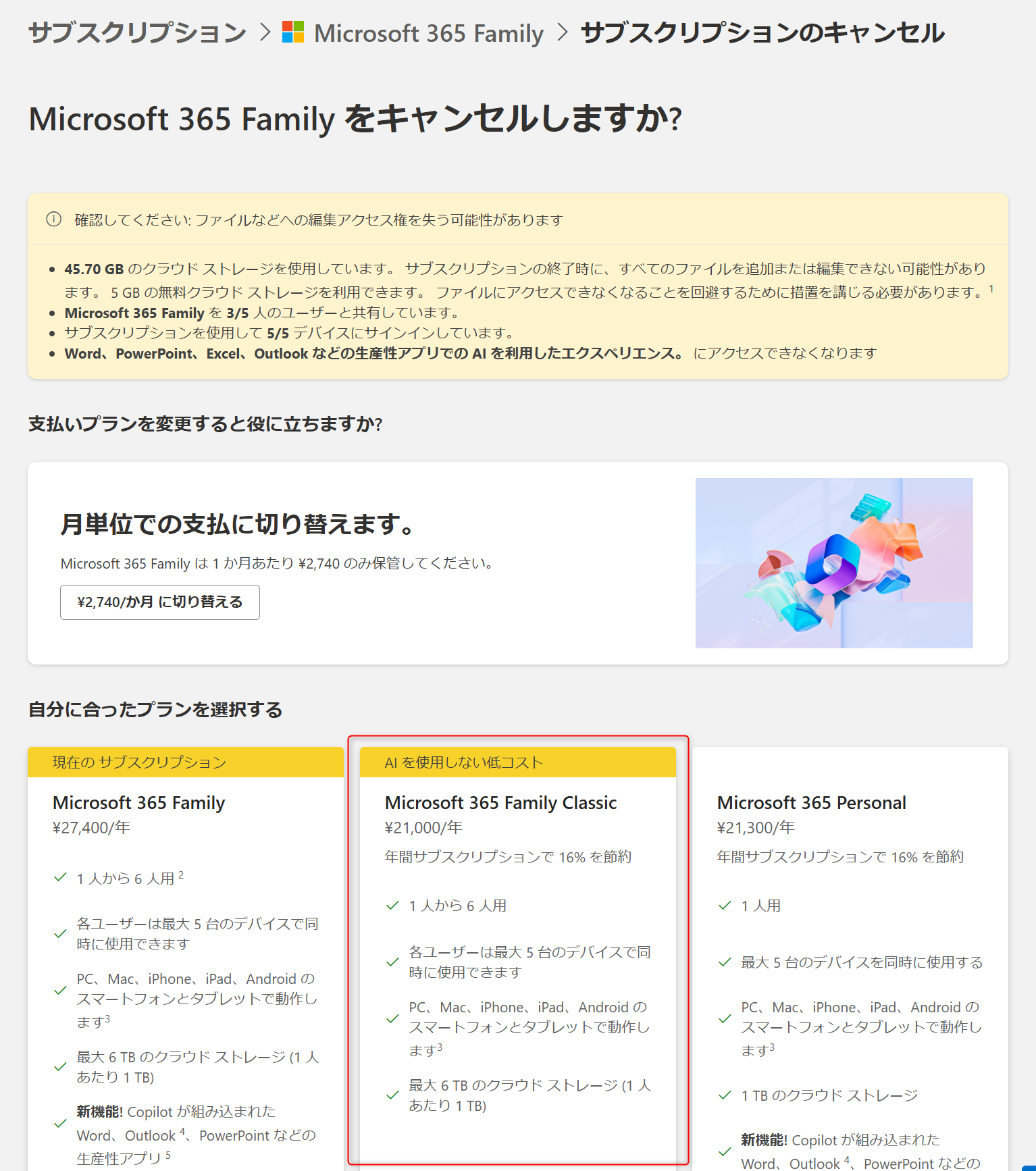 今回の大幅値上げは、Microsoft 365にAI機能(Copilot)を搭載したことを理由としています。法人向けはAI機能は別売りで年間5万円なので、それと較べるとまだ安いかもしれません。ただ、もちろん機能は異なると思いますが……。