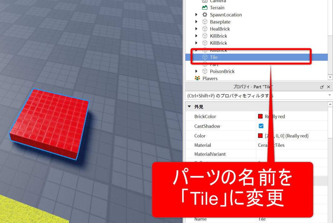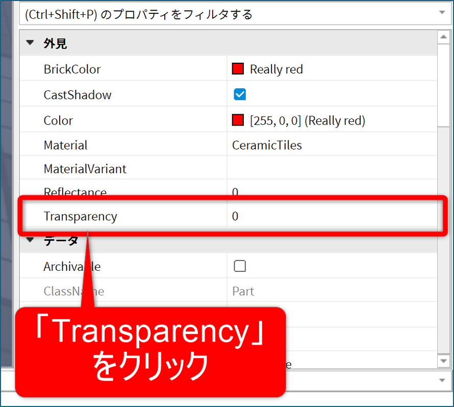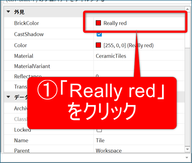 ①プロパティウィンドウの「BrickColor」の「Really red」をクリックします。
