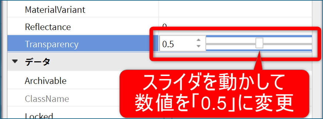 続いて、床がうっすら透けて見えるように、透明度を変更します。