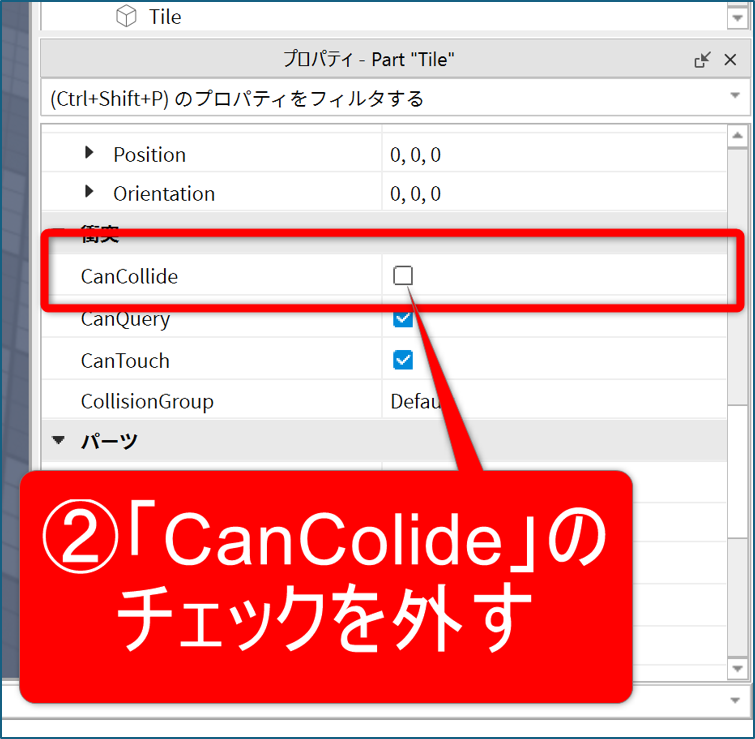 ③同じ要領で、右図に赤枠で示した「Tile」の「CanColide」のチェックを外します。