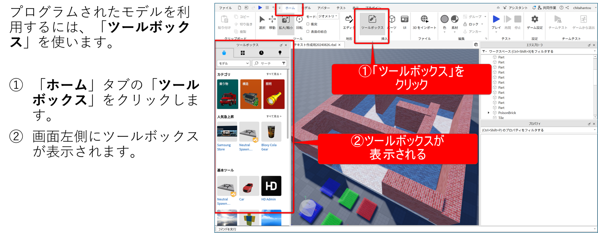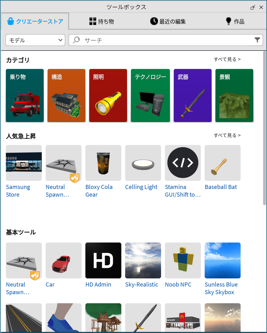 しかし、Robloxでは「ツールボックス」を使えば、ほかの人が作ったプログラムされたモデルを使うことができます。