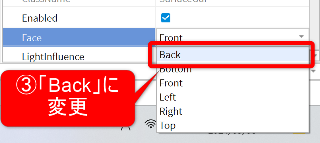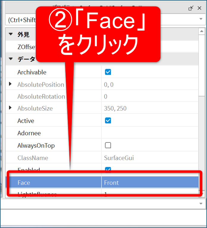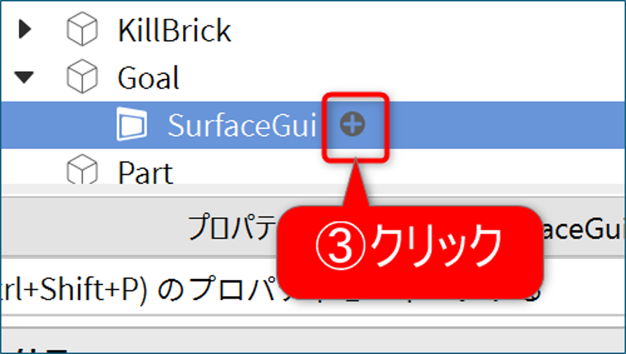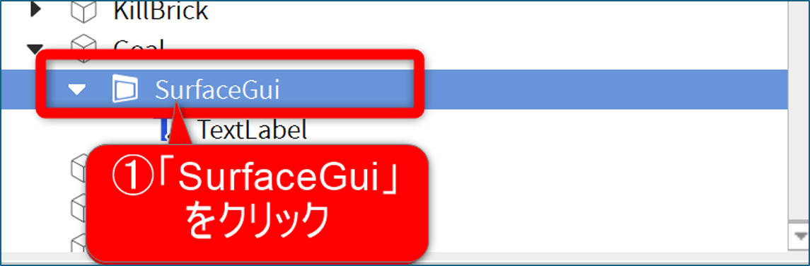 ①エクスプローラーで「Goal」の「SurfaceGui」をクリック