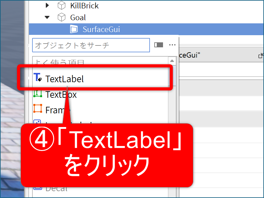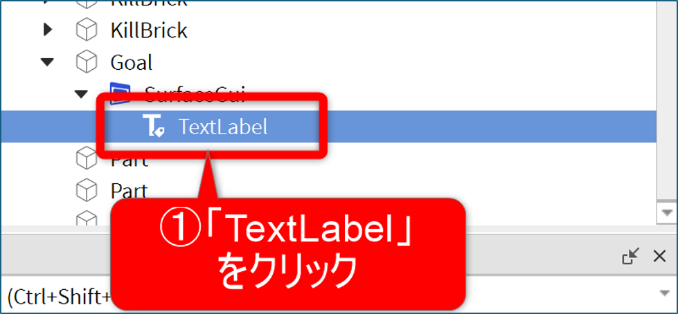 ①エクスプローラーで「Goal」→「SurfaceGui」の「TextLabel」をクリック