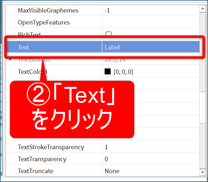 ②プロパティを下方にスクロールし、「Text」をクリックします。