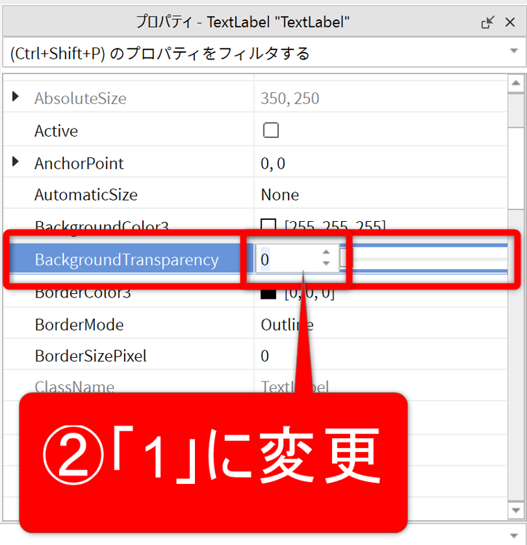 ②プロパティの「BackGroudTransparency」を「1」に変更